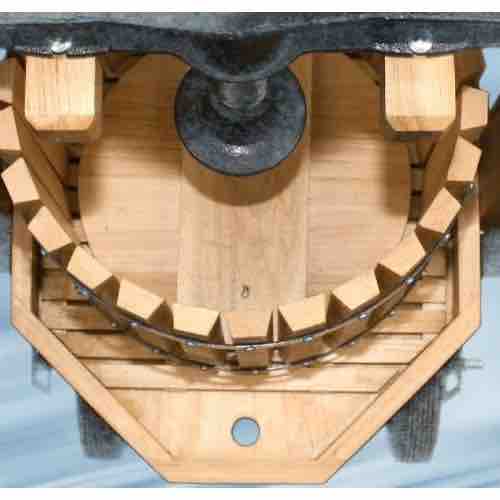 Take a close look inside the pressing drum one of Kerry’s precision-made cider presses. All the wood is hard maple, and every board foot that comes into the factory is run through his Woodmasters. The curved item is a top view of the pressing drum. Note the staves’ carefully beveled edges. The black device at the top of the picture is the heavy-duty screw that applies immense pressing power to the pressing plate. The cider’s squeezed out and pours into the tray below.